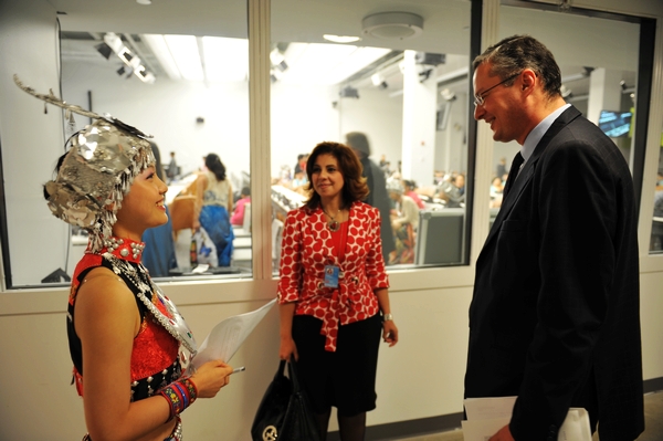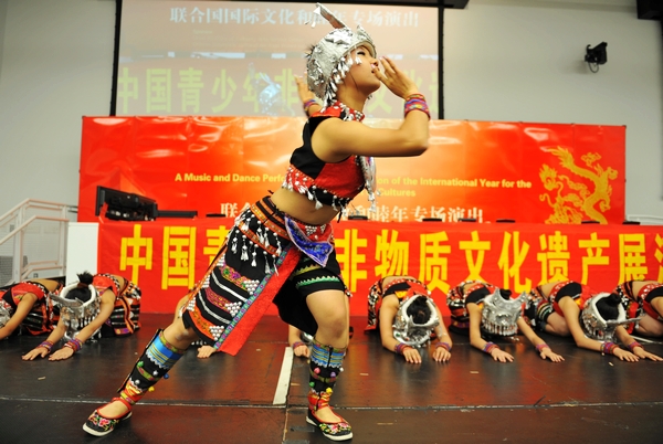身着苗家传统服饰的舞蹈队员成为联合国总部里的一道风景线