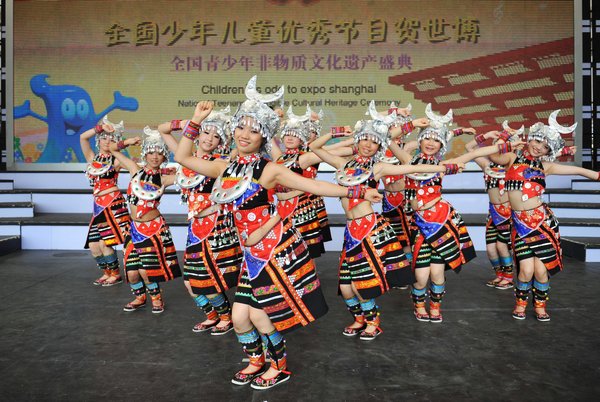 上海世博会绿地广场上,外校舞蹈队表演民族舞蹈《苗家小阿妹》