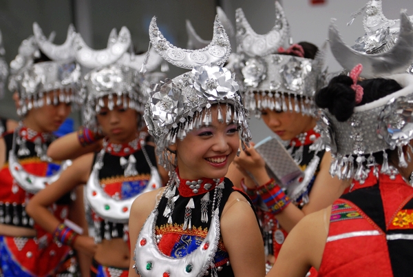 本网讯 8月3日,上海世界博览会绿地广场上乐曲悠扬。舞台上,银铃声声,舞姿婀娜;舞台下,来自世界各地的游客时而击掌叫好,时而举起相机留下美好瞬间。这是广外外校舞蹈队12位女孩正在表演民族舞蹈《苗家小阿妹》。