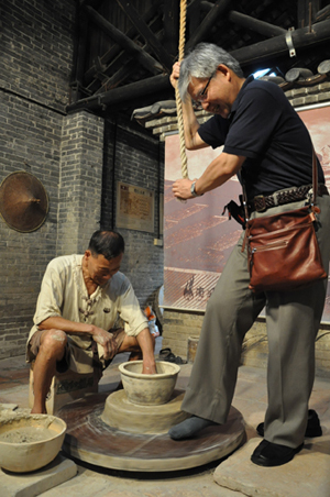 在听过龙窑的历史后,小组成员继续探索陶器的制作过程。有着64年制陶经验的师傅现场为大家用古作车演示了拉坯的整个过程。古代没有电,必须一人用脚带动轮盘旋转,另一人则进行陶器形态制作。不到5分钟,一堆不起眼的泥就在制陶师傅的手中如同变戏法般成为了一个精美的花盆。再经过上釉、烧制后,即可进入市场。整个过程不禁让在座观众啧啧称叹。