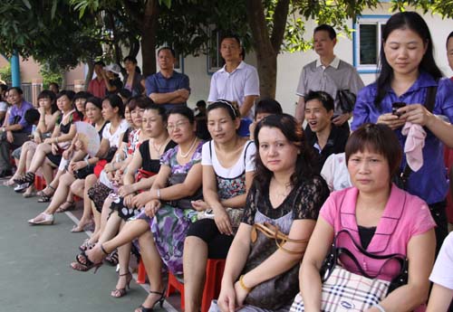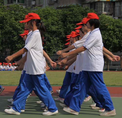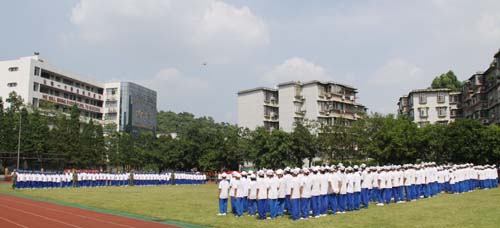 本网讯 8月30日,广外附中运动场上,500多名初中生列队完毕,整装待命,已完全做好军训汇演的准备。