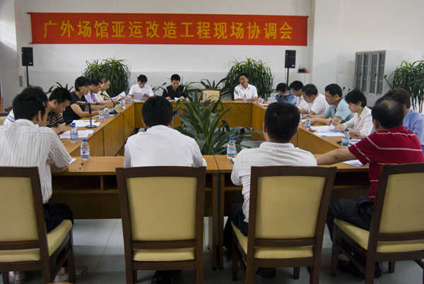 本网讯 5月27日上午9点,广外亚运场馆改造工程现场协调会在南校区大会堂A区103室广外体育场馆团队办公区召开。亚组委场馆器材部处长肖波,广州市重点办负责人杨键、李明以及其他工作人员,广外亚运场馆团队运行秘书长林少娜及媒体运行、交通、场馆保障、综合事务等业务口负责人出席了本次会议并参与了讨论。