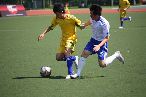 下午2:30,裁判一声哨响,比赛在炎炎烈日炎炎下准时开始。广外基本依照前几场的打法,通过大范围的长传转移,跑动拉开空当寻找机会。但开场后的几次长传的尝试都未能收到很好的成效。虽然在场面上压制住对手,但一时也找不到破门良机。