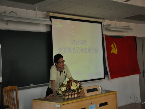 本网讯 5月19日下午,财经学院2010届毕业生党员教育大会在南校区教学楼E403举行,贯彻落实学校党委组织部关于组织开展“为党旗添彩,为母校争光”毕业生党员主题教育活动的文件精神。财经学院党委副书记许志超,教工党员代表汤胜,学工办沈长霞老师,党建小组指导老师刘芳以及2010届毕业生党员参加了大会,会议由刘芳主持。