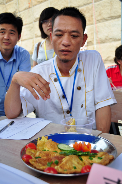 在书画协会向主办方赠送书法作品、魔术协会代表带来精彩魔术表演之后,比赛正式开始。第一环节为规定菜式烹饪比赛——制作客家传统美食“煎春角”。春角以煎鸡蛋为皮,肉羹做馅,配料较简单,但工序繁杂。调蛋羹,拌肉馅,配佐料,煎、炒、烹、炸,各道工序依次上演,毫不含糊。30分钟后,简单的配料经过选手们的精心烹制,变成一盘盘喷香的春角呈现在评委面前。其中“窈窕淑女”队伍的“扇形”春角令人眼前一亮,在精致雕花的衬托下更显专业。评委新派客美食园的师傅对此评价颇高:“这个队伍很有潜力,菜色香味俱全,很出乎我的意料”。