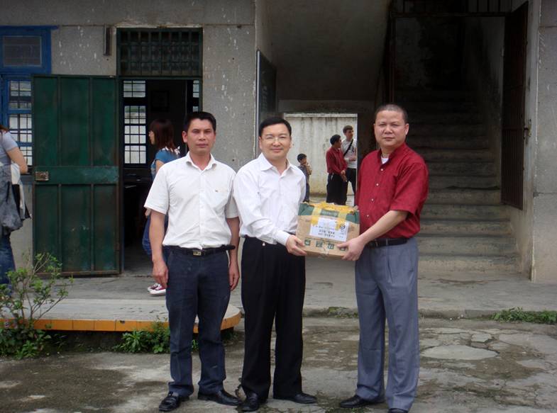 介绍会结束之后,探访团成员来到了村委会周边的小学进行参观。梁学宏将准备捐赠的文具用品交到了小学校长的手中。