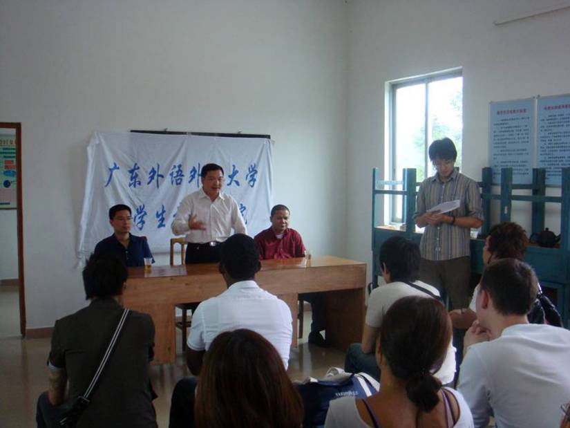 探访团成员一行在村委会办公楼二楼,与村委会书记何创环,河东村小学黄校长举行了简短的交流会。会议伊始,梁学宏代表学院向河东村委会及林宏伟对此次活动的帮助表示了感谢。他表示,此次河东村扶贫探访活动是学院国情教育的一部分,目的就是让广大留学生全面深入的了解中国的经济状况,在此次活动中有所收获。随后,王一仟针对中国及广东省的扶贫计划为同学们进行了详细的介绍。通过梁院长、王一仟的介绍,同学们对中国当代国情中的扶贫计划又有了进一步的了解,他们踊跃地提出问题,林宏伟一一进行了解答。