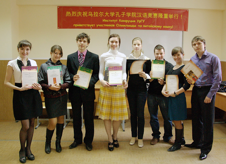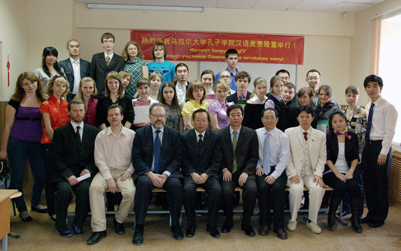 本网讯 4月24日,由我校和俄罗斯乌拉尔高尔基国立大学共同创办的孔子学院组织举行第二届汉语竞赛。来自叶卡捷琳堡市乌拉尔国立大学、乌拉尔矿业大学、乌拉尔师范大学等六所乌拉尔地区著名高校和孔子学院、孔子课堂的四十多名学员参加了本次竞赛。中国驻俄罗斯叶卡捷琳堡总领事谢金英,乌拉尔国立大学副校长弗拉基米尔•韦涅季克托维奇应邀出席了此次活动。中国驻俄罗斯叶卡捷琳堡总领馆科技文化处领事张纪山,孔子学院俄方院长谢尔盖•斯米尔诺夫以及刚刚到任的中方院长沈三山等也参加了此次活动。本次活动也是乌拉尔国立大学孔子学院2010俄罗斯“汉语年”系列活动的重要组成部分,旨在加深学生对中国文化的了解,调动学生学习汉语的积极性。