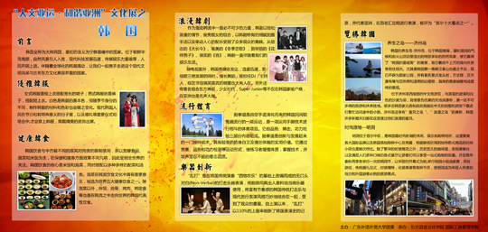 随着近年一部部韩剧带来的强势韩潮,优雅大方的韩服与休闲自然的风光令这个与中国隔海相望的国家成为了令人向往的热土,展板对韩国跆拳道、济州岛等的重笔刻画,将韩国兼具现代文明风采与古老东方文化的风貌展现的淋漓尽致。