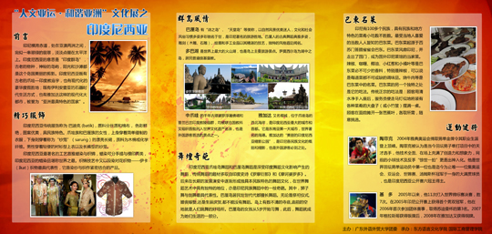 本网讯 为积极迎接亚运盛会,东语团委学生会制作了以“人文亚运·和谐亚洲”为主题的文化展板。4月28日下午,展板展出,吸引了众多路过的学生驻足观赏。本次活动为校团委主办的亚运专题教育项目之一,由东语学院与国际工商管理学院承办。展板共分为六大版块:阿拉伯世界、韩国、日本、泰国、印度尼西亚以及越南。活动旨在通过介绍亚运参与国的传统服饰、特色饮食与当地风情等相关知识,加强全校师生的亚运人文知识基础,为亚运志愿者增加文化储备。