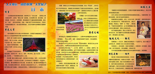提起日本,不由得让人想起绽满樱花的富士山,口味各异而同样美味的寿司,优雅而高贵的和服……展板上一张张绚丽而明艳的图片,优美流畅的文笔为师生们描述了一个“春天樱花,夏季祭奠,秋日红叶,冬季雪景”的唯美岛国。