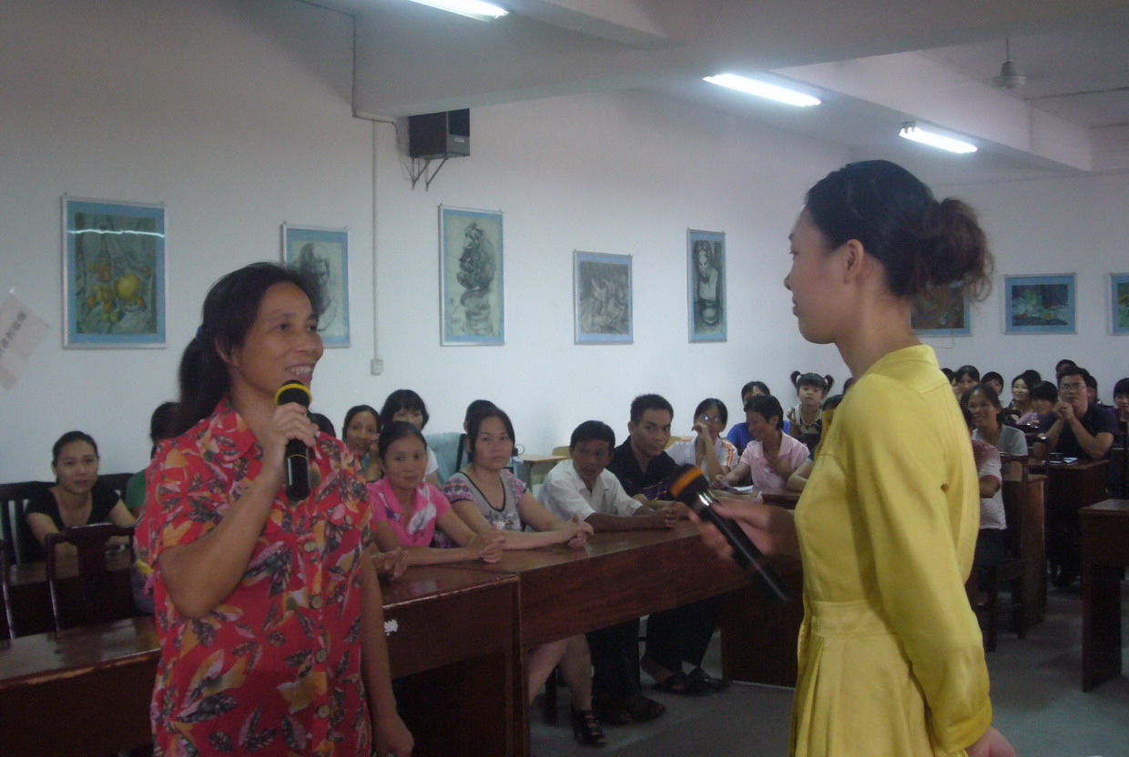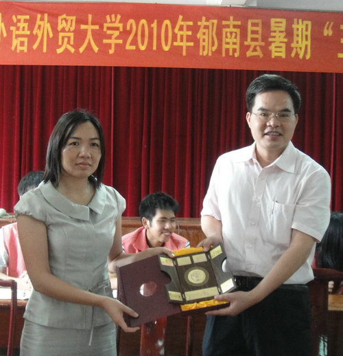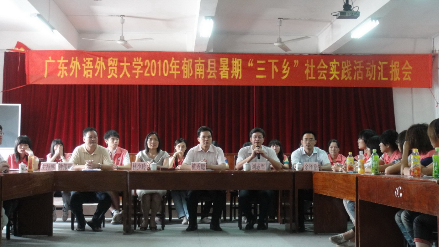 本网讯 7月30日,广外2010年郁南县暑期“三下乡”实践活动汇报会在蔡朝焜纪念中学教工会议室举行。郁南县教育局局长林少玲,广外学生处处长植秀聪、校团委书记刘志军、校团委老师余泽浩,蔡朝焜纪念中学卢副校长,参与转岗教师培训的所有基层英语教师以及我校校级学生组织郁南三下乡服务队所有成员出席这次活动。