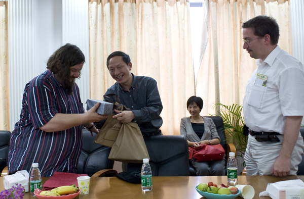 交流会结束前,马庆华向两位嘉宾赠送了礼物,对他们能亲临交流会进行指导表示感谢,并邀请他们今后多来中国、来我校思科信息学院做学术报告。“We hope we will see you again.” Kahler和Sommen 接受了礼物并希望双方能有更多的机会继续交流。
