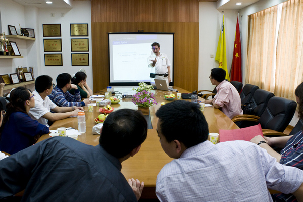交流会上,Kahler和Sommen分别作了“Clifford分析中的微局部化”和“以数学的观点考察解析信号”的学术报告。Kahler在讲解过程中,以数学公式为支点,配以数学模型和研究实例进行分析。而Sommen则以数学公式推导的形式对理论进行分析。会后,谌秋辉等教师就“Clifford分析能否应用在其他系统”的问题与两位学者进行交流和讨论。据了解,分析是上世纪70年代新兴起的一个活跃的数学分支,在理论物理和经典分析等方面有着广泛的应用。例如,麦克斯韦方程,杨(振宁)-米尔磁场理论,量子力学等。