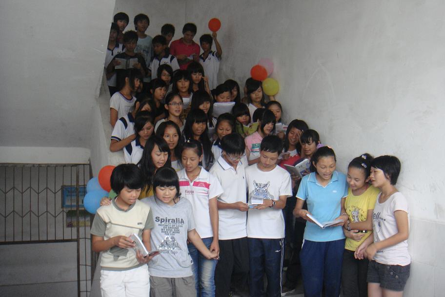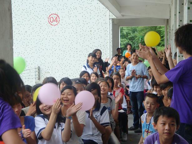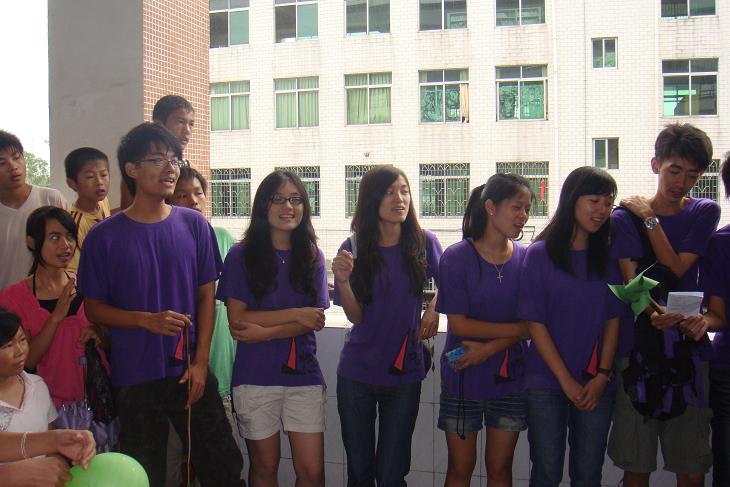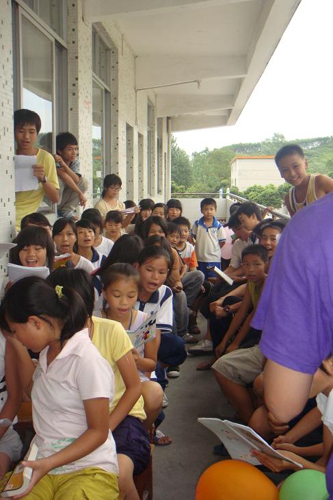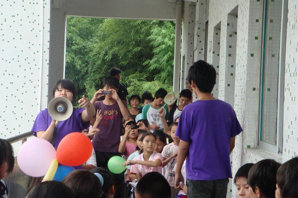 下午,广外高帆东华心译服务队三下乡活动暨大镇中学2010英语夏令营的成果展示仪式正式开始。或许因为我们的不舍,天公不作美,大有山雨欲来风满楼之势。为保证学生的安全,只能让各班学生先回教室,展示一事再作打算。队长与队员们的短暂商议后,决定让学生有秩序地搬凳子坐在教室外的走廊上,中间空出一块地方作为展示台。虽然有些狼狈和拘束,但这是我们的欢送会,是师生同乐的最后舞台。