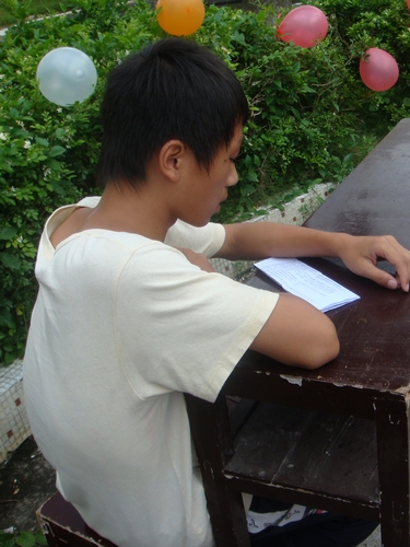下午主持人特训正式开始,从编写台词、训练站姿到如何持麦,指导老师不放过任何细节。他们遇到的第一个问题是华山的口音太重。为了练好普通话,咬准每一个字音,华山在易读错的字上标明拼音,跟着翠凤老师不断地练,甚至将主持稿折成小卡片,放在衣兜里,抓紧时间一个字一个字地进行练习。功夫不负有心人,华山的普通话有了较大的进步,声音也响亮了很多。两位指导老师也都纷纷竖起大拇指,称赞他进步大。