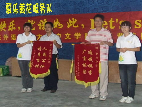 黄花队队长赠送黄花镇陈主任及中学梁副校长锦旗