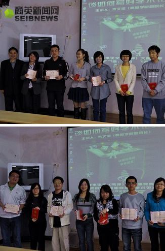 本网讯 4月2日晚,商英学院首届学术论文(书评)大赛颁奖仪式暨学术讲座在北校区六教B201举行。此次讲座由学院副院长朱文忠主讲,团学指导老师黄汐也出席了颁奖仪式。