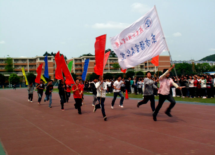 东语学子手举院旗,挥舞着奔跑在田径场上。随后,韦立新宣布体育节开幕,激烈的比赛随之开始。