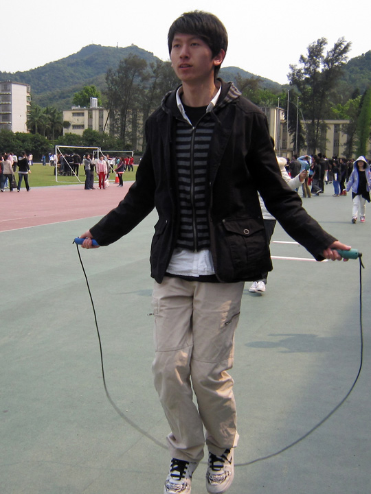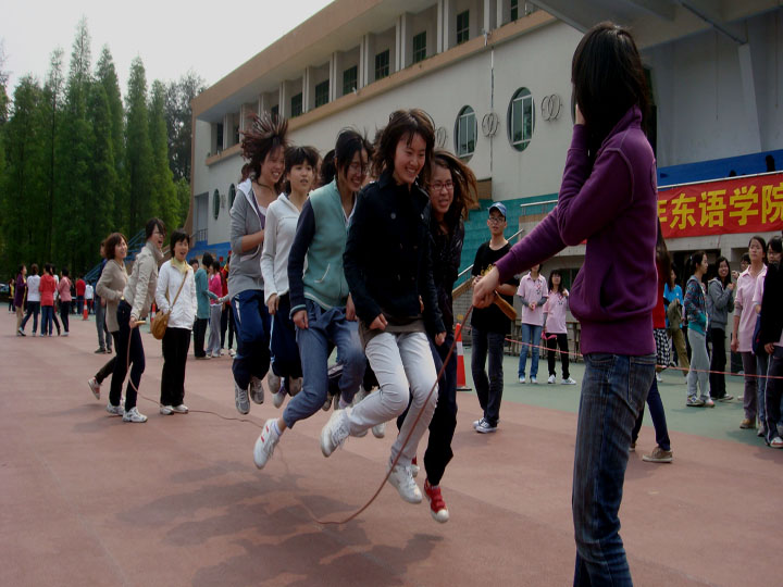 “五人六足”方兴未艾,“跳大绳”又火热登场。在“跳大绳”比赛中,参赛班级要在两分钟内待十人进入长绳中后开始计数。在这个高难度的项目中,印尼语专业的朱刚琴老师与同学们配合默契,赢得了阵阵掌声。而08级阿拉伯语班的健将们则跳出了34下的好成绩,围观的师生情不自禁地为其数数,气势逼人。