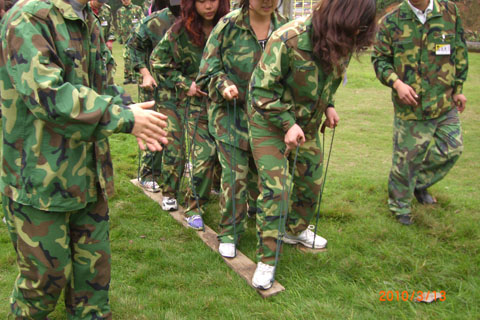 训练正式开始。最先进行的类似于五人六足的“急速电车”。由于各个参赛者的脚并没有真正贴在一起,无法从肢体上感知队友的行动,必须完全按照口令进行,这培养了大家的默契,有助于达到训练团队精神的目的。