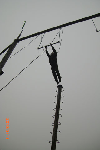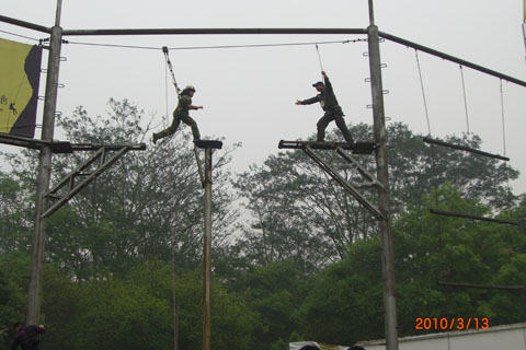 随后,各分队又在蒙蒙细雨中进行了高空训练,从6米高的空中进行跨跃。生命彷佛就被拴在了一根线上,而线的另一端就是队友。教练振奋士气的同时也不忘记幽默:“你们要相信我,我数一,二,三,跳,你们就跳,不要怕,掉下来有我接着呢。”