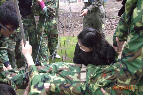 在接下来的“穿越电网”环节中,各队队员需在50分钟内全部从无规则的绳网中穿过,且身体不能碰网,碰到后的网眼将被封闭,不能继续用。一张2米多高的网布满洞眼,可志愿者们却无从下手。“小虎队”中最高的徐同学试图从最大的网眼中钻过去,却发现上下都“触电”。最后,机智的队长决定先运送一名娇小的女队员,他们配合默契,最终漂亮地完成了任务。一位队员感叹道:“要想过去必须相信我的队友,自己唯一能做的就是保持身体蜷缩不动,感觉很多双手托着自己,尽管被托得很高,但我一点都不担心,这也许就是一种团队感。”