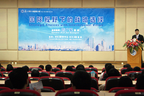 本网讯 全球经济是否回暖?国际国内经济格局已经并正在发生哪些深刻变化?置身挑战与机遇并存的大环境,我们应如何做出战略选择……针对这一系列问题,3月14日下午,我校校长隋广军教授在北校图书馆学术报告厅为MBA学生带来精彩的广外MBA讲堂第14讲——“拓宽国际视野,提升决策行动能力”。
