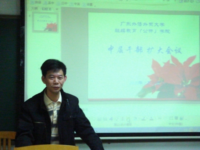 何勇斌首先作了题为“转变观念、改革机制、调整结构、共渡难关”的讲话。在讲话中,何勇斌详细分析了当前成人教育的形势,认为高校扩招、独生子女政策、学员追求优质教育资源以及职业类学校毕业生就业前景良好是造成以普通高考落榜生及中等职业学校毕业生作为生源的教育机构招生下降的主要原因。除此以外,选择非学历教育和业余学历教育的从业人员越来越倾向品牌教育机构、双转移推动珠三角低学历、低素质的求学人数锐减、国家成人教育改革发展思路转变形成的教育政策调整等方面,也给当前处于生源下滑的教育机构提出新的挑战和考验。面对这些挑战与考验,何勇斌提出了夯实基础、打造品牌,统一认识、转变观念,改革机制、顺应变化,调整结构、分类管理的应对思路,指出改变学院目前招生不乐观、前景不明朗的局面,关键在于转变观念,号召管理干部要转变过去长期受事业性单位观念、平均主义“大锅饭”的思想束缚,逐步树立市场意识、竞争意识、经营意识和自强自立的意识,找到并突出学院的特色与亮点,按市场规律运营,走内涵发展的道路。最后,何勇斌分别针对继教、公开两院的特点提出新学期的工作设想,呼吁全体管理干部上下齐心,共同努力,同时争取更多外部支持,积极开拓市场,通过多方面的宣传方式,打造“学外语到广外”的品牌。