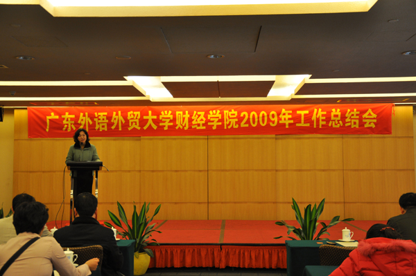 周东兰重点总结了财经学院2009年的党建和学生工作,并对2010年的相关工作作了动员布置。她表示,稳定是大局,2009年,学院积极开展党建活动,认真开展城乡基层党组织互帮互助活动,财院五个教工党支部前往惠东县安墩镇九个村深入开展“五个一”活动;完善团的组织建设,开展丰富多彩的团学活动;重视工会建设,积极组织群工活动。她提到:第五届教职工运动会学院取得的好成绩,表现出的好风气,是全体财院人力量凝聚的体现。下一步,学院要以高度的责任感和使命感扎实开展对清远市清新县龙颈镇河东村的5户贫困家庭的帮扶工作,一丝不苟地完成学校党委分配的任务。团学工作将以“打造学院品牌、服务全院学生”为宗旨,围绕专业特色,配合教学和培养目标,开展专业性学生活动,并结合“嵌入式”实践教学,组织举行“财会税综合技能大赛”,打造学生创品牌活动。此外,周东兰向全院作了搬迁动员,她强调,学院搬迁是学校资源整合优化的需要,从大局讲有利于学校协调发展,从局部讲也有利于财经学院全体教职工福利增长,财院要全力支持,全院教职工要积极配合。