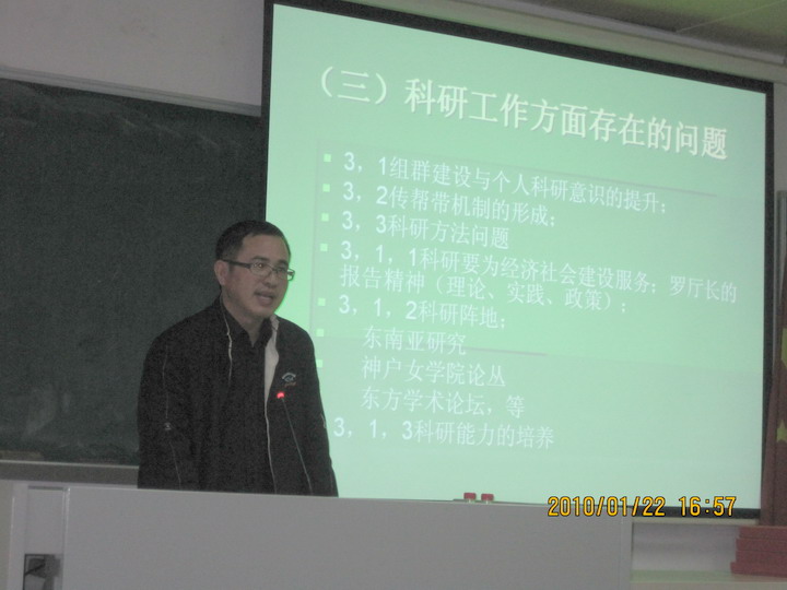 韦立新代表院领导总结学院在2009年各项工作中取得的成绩和进步,并提出学院2010年工作设想。他重点介绍了党建思政、教学科研、学科建设和学生工作等方面的亮点,强调所取得的成绩有赖于全体教职工的辛勤劳动,与校领导的关心和指导密切相关。
