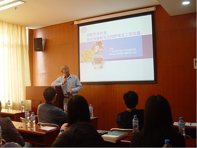 报告包括四部分:商业智能研究、中国国家自然科学基金(NSF)项目申请十大风险、NSF青年基金研究发展情况、做研究的体会与经验。其中在商业智能研究方面包括:数据挖掘与商业智能的概述、该领域在国际、中国以及广东几所高校的研究情况,DM常用算法,该领域十大热点问题和胡博士本人参与或熟知的四个数据挖掘研究实例进行详细交流。在NSF项目申请十大风险方面,胡老师介绍了包括NSF申请的一些经验和规则,如何做好项目的申请,以及介绍如何把项目做好的一些思考。报告之后,管理学院年轻老师进行了深入的讨论,整个会议进行了三个多小时。