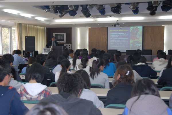 本网讯 12月24日下午,财经讲坛系列讲座第十二讲“全球化的起因、结果以及对企业的影响”在北校区财经学院办公楼四楼会议室开讲。本次讲座邀请到美国纽约理工大学管理学院主管全球项目副院长、终身教授刘贤方教授主讲。学校副校长陈德萍教授、财经学院院长陈伟光教授、副院长余鹏翼教授、刘中华教授和部分财经学院师生参加了讲座,现场座无虚席。