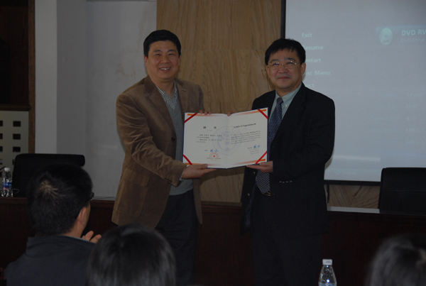 余鹏翼副院长代表财经学院师生对刘教授的到来表示热烈欢迎与感谢,现场师生们对于刘教授的30年奋斗历程和见证祖国巨变、身在国外心系祖国的情操给予热烈掌声,陈德萍现场向刘贤方 颁发了广东外语外贸大学“客座教授”聘书。