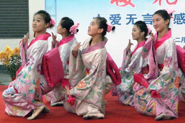 接着,艺术学院学生身着粉红色和服,撑着油纸伞,为在场嘉宾献上日本舞蹈。该舞蹈由艺术学院陈彦敏老师专门为本次樱花园揭幕而指导编排。伴着悠扬古朴的日本民乐,她们婀娜的舞姿一如樱花飘零其间,给寒冷的冬日添上了暖意。