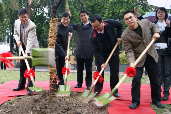 最后,徐真华宣布广外樱花园揭幕,并与刘建达、孙建军、王进宏等,师生共同为樱花园揭幕及为樱花树培土。