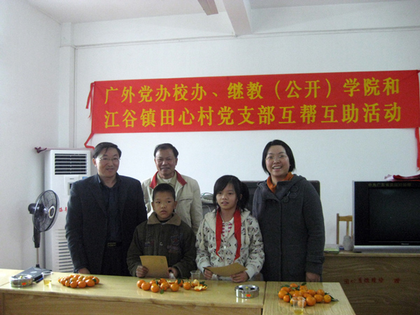 本网讯 12月22日,党办校办党支部、继教学院行政第一党支部到四会市江谷镇田心村开展“冬至送温暖”城乡互帮互助活动。田心村党支部书记邓得胜、我校党办校办主任李云明、成教办主任崔献光、继教学院机关一支部书记曹灵辉以及两个支部的部分党员参观了新落成的村委办公楼并一起过组织生活。