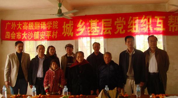 本网讯 12月18日下午,翻译学院教工党支部到广东四会市大沙镇安平村、富溪村开展城乡基层党组织互帮互助活动,看望和慰问两个村的贫困党员和贫困农户。参加此次活动的有翻译学院党委书记高云坚、翻译学院MTI中心主任赵军峰教授、词典学研究中心夏立新副教授、高教研究所所长朱建成研究员等教工党员。