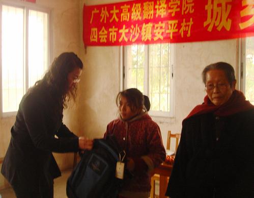 给特困家庭的孩子送上书包和文具