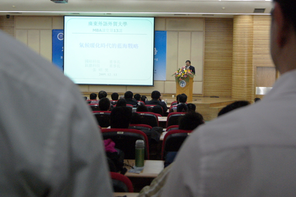 本网讯 12月13日下午,广外MBA讲堂第13讲在北校区图书馆学术报告厅内开讲。台湾国硕工业科技股份有限公司董事长、台湾钰德科技股份有限公司董事长、台湾讯联生物科技股份有限公司董事监察人张昭焚为现场听众带去了一场题为“气候暖化时代的蓝海战略”的讲座。我校校长隋广军、副校长石佑启出席了讲座,讲座开始之前隋广军为张昭焚颁发客座教授聘书,双方互赠礼物。