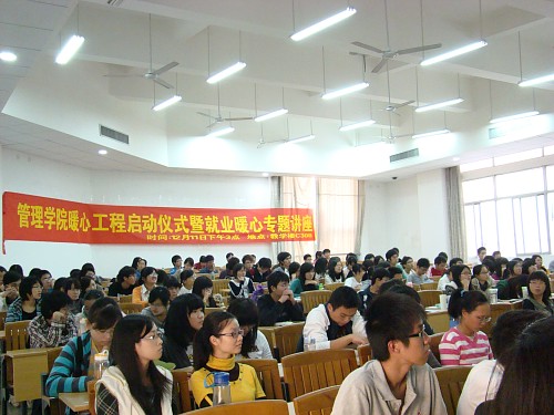 本网讯 12月11号下午,管理学院暖心工程启动仪式暨就业暖心专题讲座在C栋308课室举行。强生医疗亚太区2007年销售冠军、华南区经理许国良,管理学院团委书记余海波以及管理学院心理危机援助队指导老师刘富先出席了此次活动。