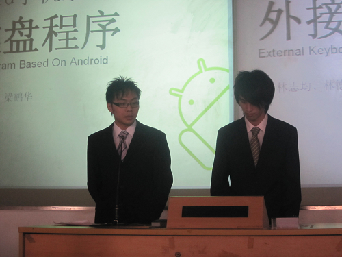 作为首个上场的队伍,基于Android手机系统的外接键盘程序的创作者之一梁鹤华毫不怯场,从容介绍了他们的主要研究内容和项目优势。但评委老师们可不轻易放过他们,首先就问到:“出门都要带个键盘,你们觉得这样会方便吗?”而他也是有备而来:“现在已有可折叠键盘,其最大特点是重量轻,且折叠后与手机一样大小。”精彩流利的答辩足见选手准备得非常充分。