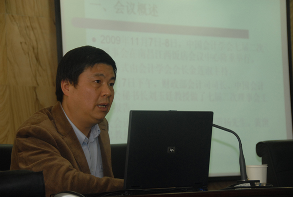 陈德萍教授首先向财院全体教师传达了11月7日-8日在南昌召开的“中国会计学会七届二次理事会”会议精神,给大家带来最新的财政和会计改革动向,会计学术理论的研究方向以及热点难点。并结合我校已成为中国会计学会的单位会员(理事单位),提出会计学科的发展思路:巩固成果、跳出省内、参与高端、影响国际。