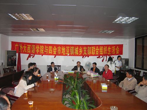 在地豆镇镇委会议室,西语学院法语、德语、俄语、西班牙语和办公室5个教工支部党员与地豆镇水车村、邓寨村、塔崀村、大东村和大布洞村5个村党支部书记召开了“建学习型党组织,做学习型党员”联合组织生活会。西语学院党委书记黄巧萍在会上作了主题发言,他联系城乡、高校和基层实际提出并回答了为何要“建学习型党组织,做学习型党员”和如何“建学习型党组织,做学习型党员”的问题。与会代表围绕主题展开了热烈讨论,增进了理解,形成了共识。随后,西语学院各教工支部分别向对口建设的村支部捐赠了一批学习用书。