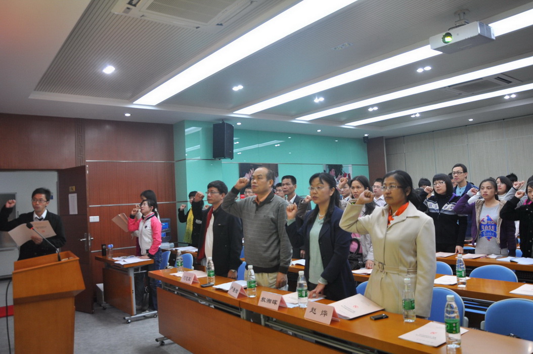 在神圣庄严的国歌声中,研究生会党支部成立大会拉开了帷幕。首先由卢景辉讲话,他代表学校党委对研究生会党支部的成立表示祝贺,并对研究生会党支部提出了期望。他表示,我校研究生总体思想素质、专业水平高,目前研究生党员占研究生总数的一半以上,研究生会党支部要发挥带头作用,加强与各学院研究生的联系,营造出浓厚的学术氛围,增强广外研究生的学术研究能力。卢景辉希望研究生会党支部在学校基层组织建设品牌活动中,积极探索党组织建设的有效途径,把研究生会党支部建成一支高素质、高水平的研究生党员干部队伍,在研究生各基层组织树立起一面旗帜,带动研究生基层党组织建设的发展。