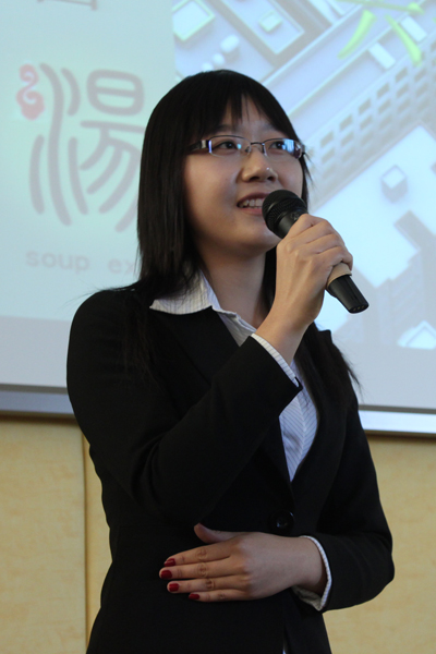 “传递关怀传递爱,健康生活喝出来”,“汤专家”餐饮连锁有限公司团队现场给评委们递上自己研制的汤品,递上了一份贴心服务。团队围绕白领一族健脾益胃的需求,以“量身定汤”为核心理念,通过建立客户数据库和高效的外送网络等营销手段形成自己的品牌效应。据他们介绍,公司将先在市区主要商业圈开设三家连锁店,接着将其覆盖到大学城,继而再到佛山深圳等周边城市。精彩的现场展示及全面的产业营销分析获得了评委们的一致好评。