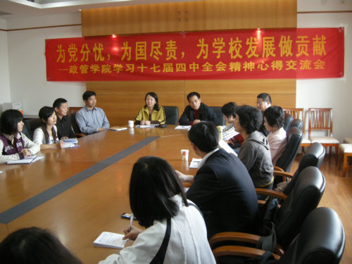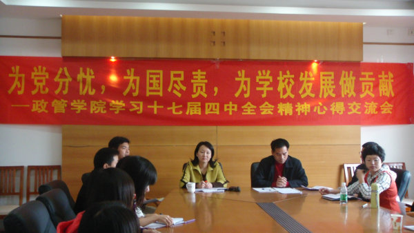 随后,与会人员根据自身学习工作的实际情况,联系十七届四中全会精神各抒己见,各自把学习十七届四中全会的心得体会与在场人员分享、交流并进行讨论。政治理论教学部主任张剑抒老师强调无论是在革命战争年代,还是在国家和平建设时期“我国人民对党的信心与信任都很重要”;政治理论教学部党支部书记宋善文教授从执政党的执政规律这个认识角度阐述了自己对十四届四中全会精神的心得体会;思想道德与实践教学部崔艳红老师联系当前金融危机和大学生就业困难的实际,详细介绍了自己对大学生该如何把会议精神运用于解决实际问题的看法;公共管理系主任郑亚伟老师联系《决定》的精神,从三个方面具体分析了青年大学生应如何为党分忧,为校为院做贡献;学生党建工作委员会助理陈宝芳同学在理解《决定》内容的基础上,提出了自己对促进学院党建发展的具体建议。
