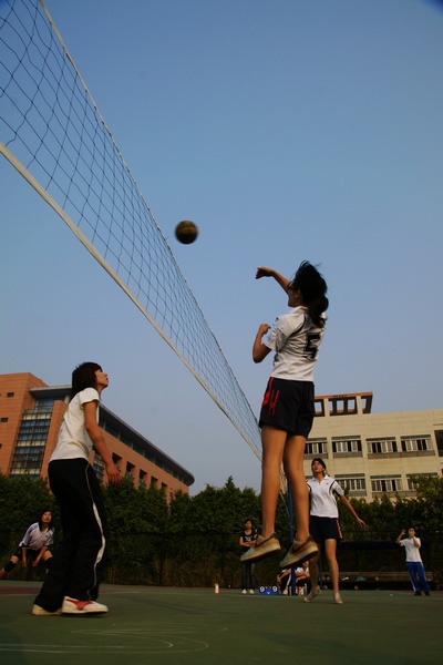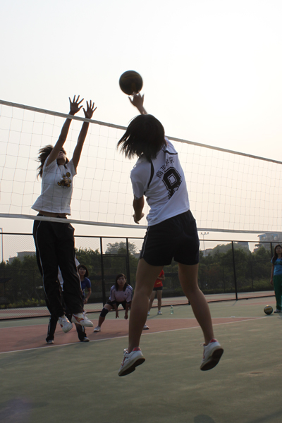 在另一场女子组信息对商英的比赛中,商英以同样的比分完胜。比赛开始,首先由信息队发球。双方都全神贯注,毫不懈怠,渴望拿下首球以鼓舞士气。信息的二传手张慧珊看到对方站位的空当,一个灵巧的假传真吊,出其不意地把球推向对方场地的空当处。商英队员反应不及,信息占得先机。