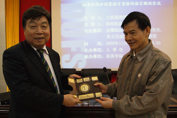 本网讯 11月17日下午,著名教授论坛第一百零九讲在我校财院水上演示厅开讲。教育部语言文字信息管理司副司长王铁琨教授应邀为我校师生带来了一场题为《珍爱和保护中华语言资源的语言规划尝试》的讲座。此次讲座由人事处主办,国际商务英语学院承办。我校党委副书记金耀观,人事处副处长谢文新,商英学院副院长朱文忠,商英学院法律语言研究所所长、博士生导师杜金榜教授等作为嘉宾也出席了此次讲座。
