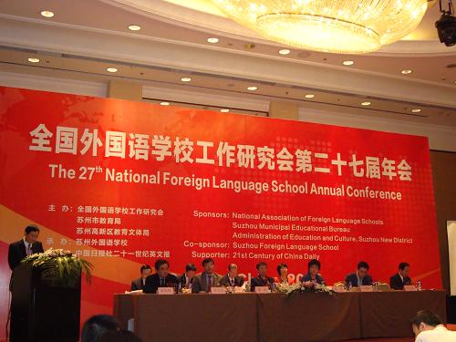 本网讯 10月30日至11月3日,全国外国语学校工作研究会第27届年会在苏州举行。本次年会由苏州外国语学校承办,来自全国118所外国语学校的代表参加了本次年会,外校李建民校长和中学部教学处谢仁发主任出席了会议。本次会议的主题为:规范办学,提高质量,走内涵发展的道路。